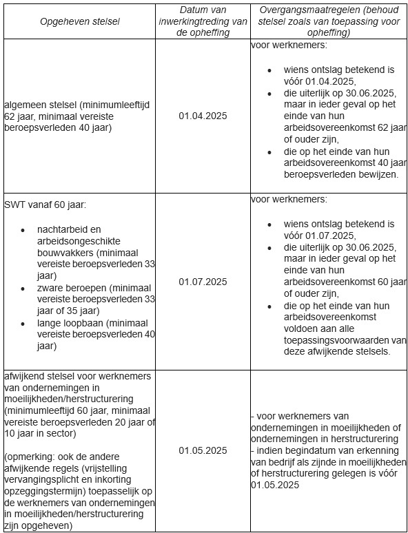 Omdat die data en overgangsmaatregelen verschillen al naargelang het beoogde stelsel, vindt u hieronder een schematisch overzicht van de verschillende opgeheven stelsels met vermelding van de verschillende data van stopzetting en van de begeleidende overgangsmaatregelen.